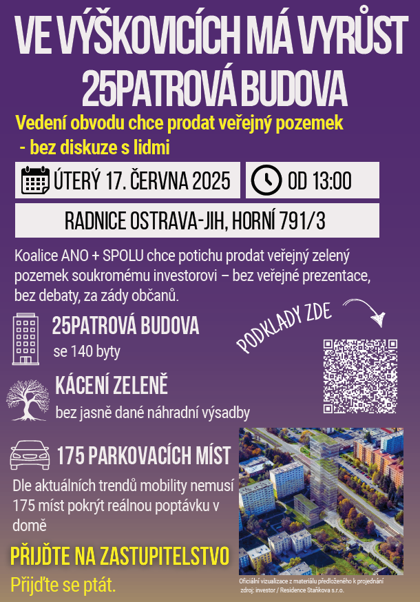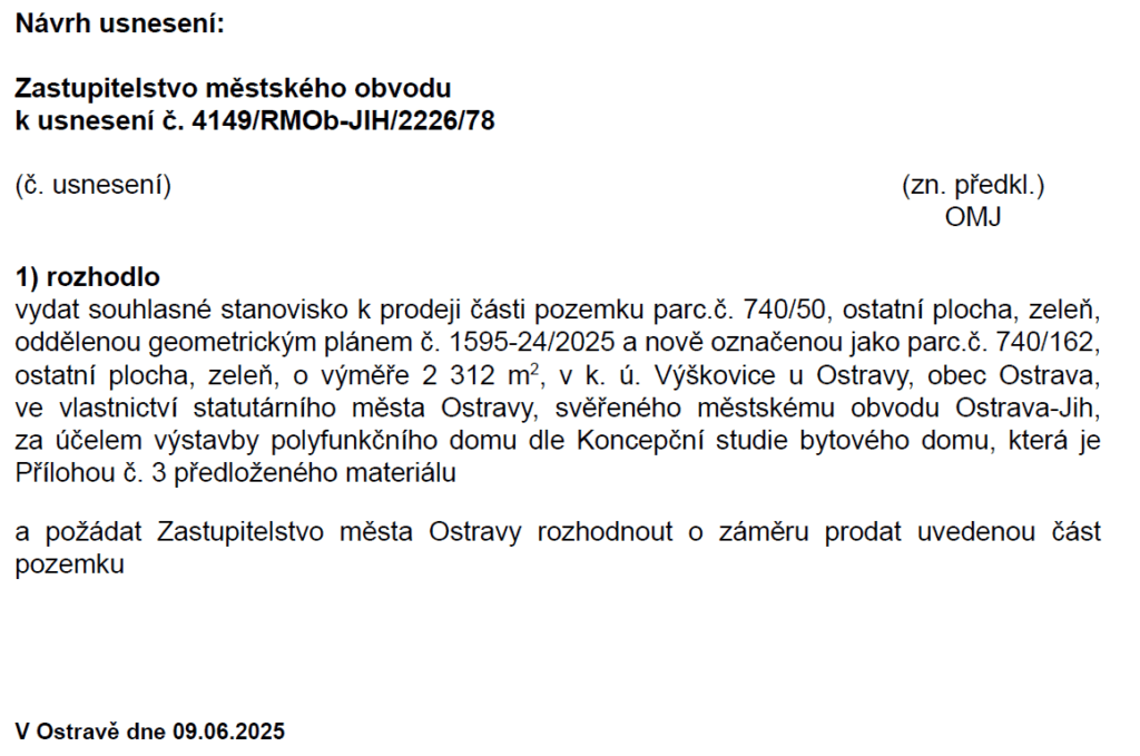 Klasickou zhavarovanou komunikací je záměr prodeje pozemku č.p. 740/50 v k.ú. Výškovice. Původní záměr byl předložen na základě požadavku investora Residence Staňkova, s.r.o. za účelem výstavby 25 patrové budovy. Záměr, a i jeho komunikace se s nadšením nesetkala. Vezměme to ale popořádku.