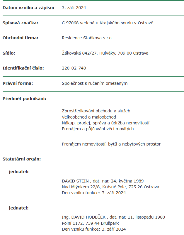 Dle všeho investor s koupí parcely počítal, protože za tímto účelem vznikla dne 3. 9. 2024 společnost Residence Staňkova s.r.o. Proč by někdo zakládal společnost pro nákup nemovitostí a výstavbu s tím to jménem, kdyby tam nechtěl stavět? Společnost také vznikla 16 dní předtím, než zastupitelstvo Ostravy-Jihu schválilo Strategické pozemky.